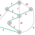 # 최단 경로 최단 경로(shortest path)문제는 정점 u와 정점 v를 연결하는 경로 중 간선들의 가중치 합이 최소가 되는 경로를 찾는 문제다. 간선의 가중치는 경우에 따라 비용, 거리, 시간 등으로 해석될 수 있다. 아래의 그래프를 살펴보자. 정점 0에서 정점 3으로 가는 최단 경로는 ( 0, 4, 1, 2, 3 )이고 이 때의 비용(거리)은 3 + 2 + 4 + 2 = 11 이다. 정점 0에서 정점 3으로 가는 다른 경로가 얼마든지 존재하지만, 최소의 거리로 갈 수 있는 방법은 이 방법 뿐이다. 가중치는 가중치 인접 행렬이라고 불리는 2차원 배열에 저장된다. 가중치 인접 행렬은 기존의 인접행렬과 차이점이 있다. 기존의 인접 행렬에서는 간선이 없는 구간에는 행렬의 값을 0으로 했었다. 그러나 가..